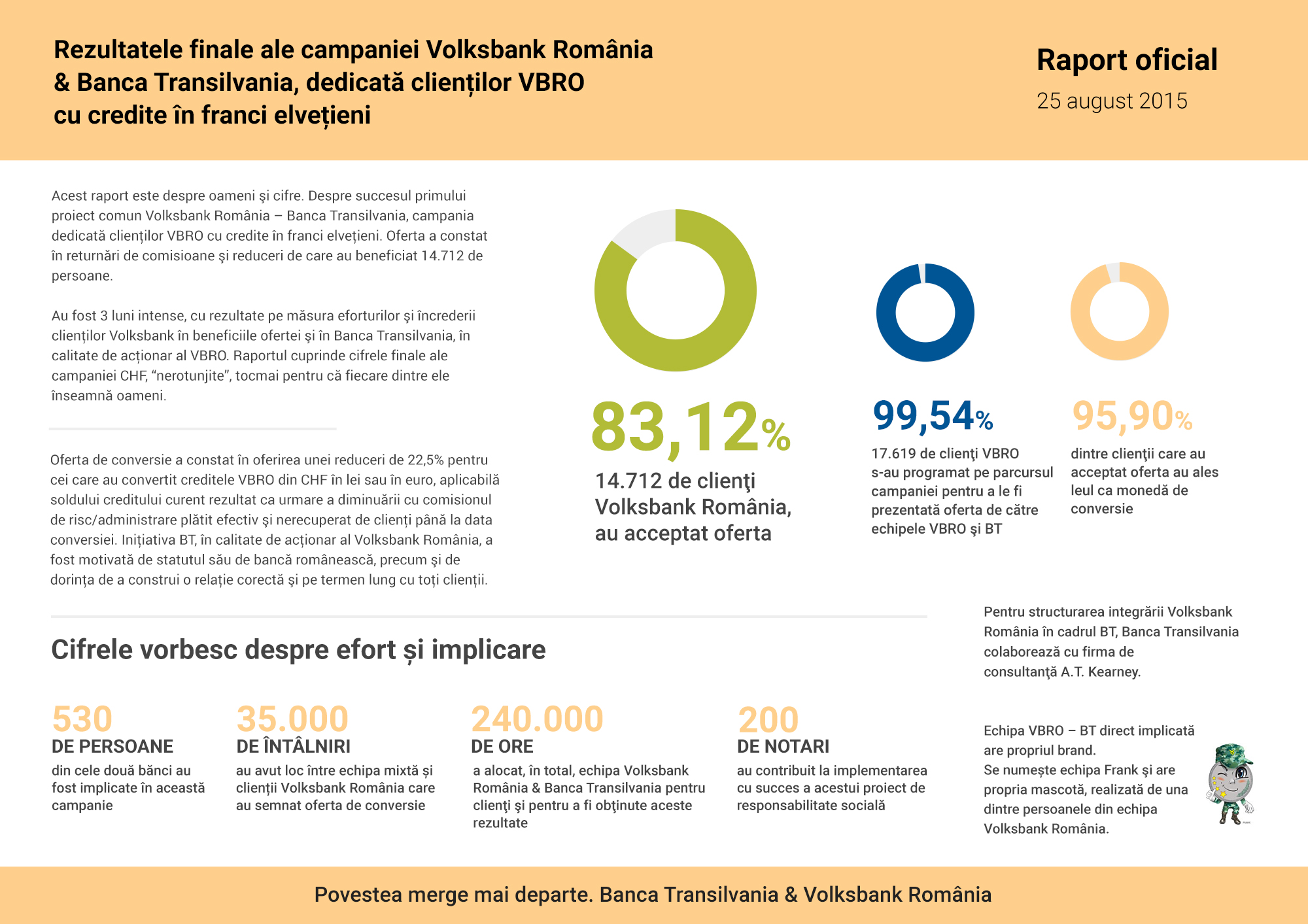 83,12% dintre clientii Volksbank Romania cu credite in franci elvetieni au acceptat oferta de conversie in lei si euro 25.08.2015 1 2284 Rezultatele finale ale campaniei Volksbank Romania & Banca Transilvania83,12%, adica 14.712 dintre clientii eligibili ai Volksbank Romania (VBRO) cu imprumuturi in franci elvetieni au acceptat oferta de conversie propusa de VBRO si de Banca Transilvania (BT). BT face public raportul oficial cu cifre aferente finalului campaniei.Rezultatele campaniei de conversie a creditelor CHF:14.712 de clienti Volksbank Romania, adica 83,12% din cei vizati, au acceptat oferta;17.619 de clienti VBRO, reprezentand 99,54% dintre cei vizati, s-au programat pe parcursul campaniei pentru a le fi prezentata oferta de catre echipele VBRO si BT;95,90% dintre clientii care au acceptat oferta au ales leul ca moneda de conversie;Echipa mixta implicata in aceasta campanie a cuprins 530 de persoane din cele doua banci, din retea si Sediile Centrale;Au avut loc peste 35.000 de intalniri intre echipa mixta si clientii Volksbank Romania care au semnat oferta de conversie;Peste 200 de notari au contribuit la implementarea cu succes a acestui proiect de responsabilitate sociala.Omer Tetik, Directorul General al Bancii Transilvania, declara: "Multumim clientilor Volksbank Romania pentru incredere, ne dorim ca aceasta oferta sa fie inceputul unei colaborari pozitive, pe termen lung. De asemenea, multumim echipei mixte Volksbank Romania – Banca Transilvania, pentru cele peste 240.000 de ore dedicate colaborarii cu clientii VBRO, pe parcursul campaniei. Aprecierea noastra se indreapta, de asemenea, catre Uniunea Notarilor Publici si notarilor implicati, pentru rabdarea si ajutorul acordat in implementarea acestui proiect de responsabilitate sociala".Oferta de conversie, desfasurata pe parcursul a trei luni, a constat in oferirea unei reduceri de 22,5% pentru cei care au convertit creditele VBRO din CHF in lei sau in euro, aplicabila soldului creditului curent rezultat ca urmare a diminuarii cu comisionul de risc/administrare platit efectiv si nerecuperat de clienti pana la data conversiei.Solutia Volksbank Romania & Banca Transilvania pentru diminuarea datoriilorIn prezent, la Volksbank Romania se desfasoara o noua campanie, prin care datoria aferenta creditelor curente ale clientilor VBRO persoane fizice, indiferent de moneda imprumutului, este diminuata cu echivalentul sumelor achitate de acestia ca si comision de risc/de administrare si/sau de rezerva minima obligatorie si nerestituite anterior. Diminuarea datoriei se realizeaza automat, pana la data de 30 septembrie a.c. Solutia are efect pozitiv asupra a aproximativ 15.000 de clienti ai Volksbank Romania.Pentru structurarea integrarii Volksbank Romania in cadrul BT, Banca Transilvania colaboreaza cu firma de consultanta A.T. Kearney. Cu peste 90 de ani de traditie in consultanta, compania este prezenta in 40 de tari din intreaga lume, fiind activa in Romania, de peste 10 ani.Sursa: Comunicat de Presa Banca Transilvania Articole similare Credite Subiecte relevante comision de risc moneda credit RON (lei) CHF (Franci Elvetieni) Q & A