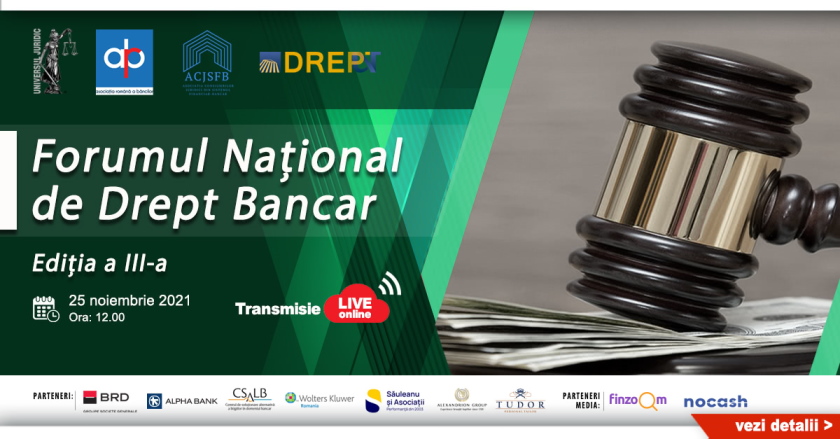 Grupul editorial Universul Juridic organizează joi, 25 noiembrie 2021, cea de a treia ediție a FORUMULUI NAȚIONAL DE DREPT BANCAR, eveniment care își propune să evidențieze, cu ajutorul unor specialiști cu recunoaștere profesională certă, care sunt evoluțiile în ultimii 30 de ani în sistem, principalele