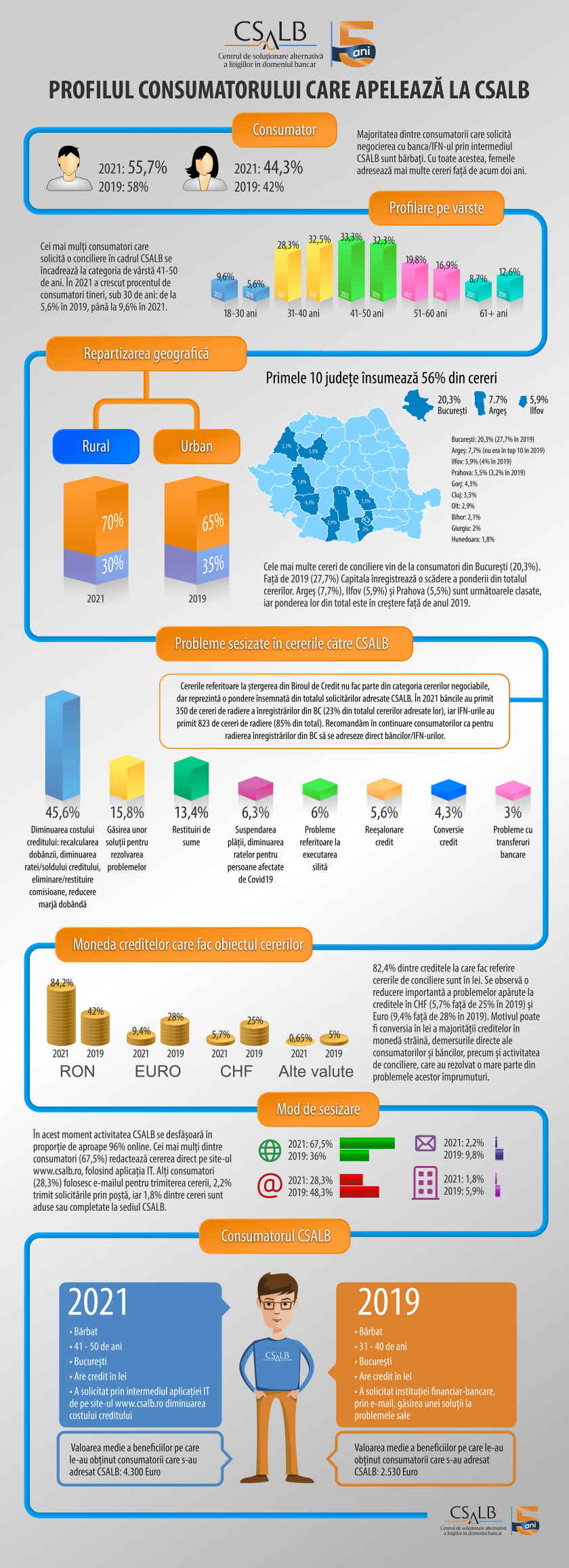 Ce au solicitat consumatorii în raport cu băncile? Beneficiile obținute în urma negocierilor, cu 70% mai mari decât înaintea crizei sanitare 12.01.2022 0 632 Ultimii doi ani de criză au adus modificări importante în profilul consumatorului care se adresează Centrului de Soluționare Alternativă a Litigiilor în domeniul Bancar (CSALB). Analiza celor 2.525 de cereri de negociere cu băncile/IFN-urile trimise către CSALB în 2021 arată că profilul consumatorului de servicii financiar-bancare este al unui bărbat din București, cu vârsta cuprinsă între 41-50 de ani, care are un credit de nevoi personale în lei și care solicită băncii diminuarea costului creditului. Beneficiile obținute în urma negocierii sunt semnificativ mai mari față de anul anterior crizei. Dacă în 2019 valoarea medie a beneficiilor obținute într-o negociere era de aproximativ 2.500 de euro, anul trecut această valoare a fost de 4.300 de euro. "În ultimii doi ani observăm o profesionalizare a concilierii, dar și îmbunătățirea rezultatelor negocierii dintre consumatori și bănci. Chiar dacă am avut mai puține dosare de negociere decât în anul de vârf 2019 (555 de dosare în 2021 față de 664 în 2019), anul trecut a fost cel mai bun în privința negocierilor încheiate cu împăcarea părților. Practic, 9 din 10 negocieri s-au încheiat cu acceptarea de către cele două părți a soluțiilor propuse de conciliatorii CSALB. O contribuție pozitivă la acest lucru au avut-o și recomandările pe care le-am transmis băncilor pentru a accepta cât mai multe cereri de la consumatori. Spre exemplu, am recomandat băncilor să reanalizeze cererile respinse, mai ales acolo unde consumatorii aduc argumente în susținerea solicitării lor. Rezultatul a fost că, pentru unele cereri inițial refuzate, băncile și-au reconsiderat opinia și s-au constituit dosare. Ne așteptăm ca acest mod de operare să devină un standard în felul în care băncile analizează cererile și decid dacă intră sau nu în negociere. Rezultatele sunt resimțite și de consumatori: valoarea medie a beneficiilor obținute din conciliere a crescut cu 70% față de anul 2019 – de la 2.530 de euro la 4.300 de euro per dosar încheiat cu împăcarea părților. Astfel, dacă eliminăm din calcul cererile care nu pot face obiectul unei negocieri, cum ar fi cererile de radiere din Biroul de Credit, putem spune că peste 80% dintre consumatorii care s-au adresat CSALB cu o cerere argumentată în raport cu băncile, au găsit o rezolvare la problemele lor", spune Alexandru Păunescu, membru al Colegiului de Coordonare al CSALB. Sursa: CSALB Articole similare Financiar Subiecte relevante CSALB (Centrul de Solutionare a Litigiilor din Sectorul Bancar) Q & A