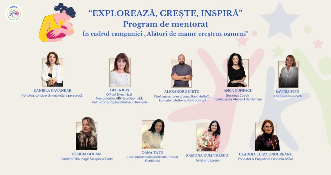 Fundația ASSA lansează Programul Național de Mentorat „Explorează, crește, inspiră!”, este un proiect special inițiat de Claudia Ungureanu, fondator&Președinte al Fundației ASSA, în parteneriat cu Daniela Gavankar- Psiholog, consilier de dezvoltare personală, profesor universitar asociat al Universității Spiru Haret și Delia Rus - consilier de dezvoltare personală și Instructor certificat Neuroptimal ® în România, care vor fi și mentori permanenți ai programului.