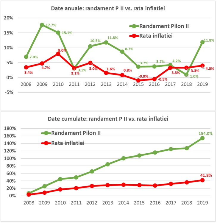 Randamentul total realizat de toate fondurile de Pilon II de la start (20 mai 2008) si pana la finele anului 2019 a fost de 154%, adica un randament mediu anualizat de 8,35% pentru toata perioada de functionare a Pilonului II. Acest indicator este cu mult peste rata totala inflatiei din perioada analizata (41,8%), respectiv rata medie anualizata a inflatiei pentru exact aceeasi perioada (3,05%).