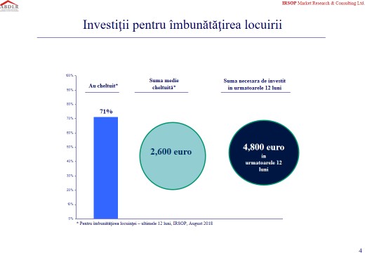 In ceea ce priveste suma necesara pe care romanii vor sa o investeasca pentru imbunatatirea calitatii locuirii aceasta se ridica la 4.800 EUR in urmatoarele 12 luni. In anul 2017, romanii au cheltuit in medie pentru imbunatatirea confortului locativ circa 2.600 EUR.