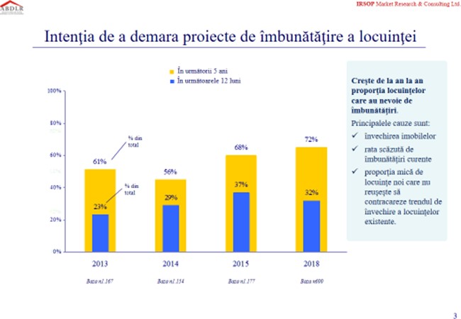 Intentia romanilor de a demara proiecte de imbunatatire a confortului locativ creste de la an la an. Circa 72% dintre ei doresc sa porneasca un asfel de proiect in urmatorii 5 ani in timp ce 32% intentioneaza sa faca acest lucru in urmatoarele 12 luni, se arata intr-un studiu realizat de IRSOP pentru Asociatia Bancilor pentru Domeniul Locativ din Romania (ABDLR).