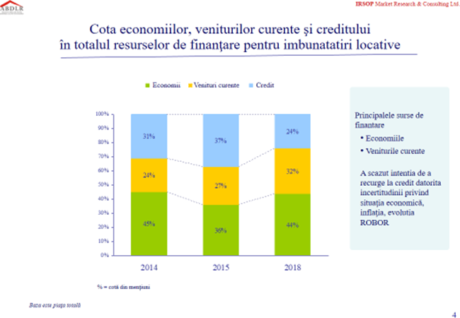 Principala sursa de finantare pentru efectuarea lucrarilor de imbunatatire locativa o reprezinta economiile deja realizate. Apoi urmeaza ca sursa de finantare importanta veniturile curente. Se observa o scadere a intentiei de a recurge la