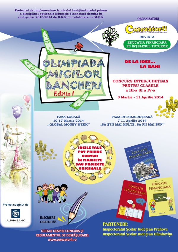 Olimpiada Micilor Bancheri - Editia I 2014 11.03.2014 6 1859 Ca urmare a implementarii, in anul scolar 2013 - 2014, de catre Banca Nationala a Romaniei, in colaborare cu Ministerul Educatiei Nationale, a proiectului de introducere la nivelul invatamantului primar a disciplinei optionale "Educatie financiara" (CDs), a devenit necesara si o prima evaluare a nivelului de cunostinte ale copiilor, asa cum se procedeaza si la celelalte discipline optionale.In aceste conditii, a fost lansata prima editie a concursului de educatie financiara "Olimpiada micilor bancheri", considerand ca acesta reprezinta un instrument util pentru evaluarea acestei discipline noi.Organizatorii concursului sunt: Editura Explorator - Revista CUTEZATORIIsi Ligia Georgescu - Golosoiu, consilier directie BNR, autorul setului de auxiliare de Educatie Financiara pentru invatamantul primar si coordonatorul colectivului de elaborare al programei scolare si al proiectului.Parteneri: Inspectoratul Scolar Judetean Prahova si Inspectoratul Scolar Judetean Dambovita.Prima editie a Olimpiadei se va desfasura in doua judete, in care optionalul se afla deja in al doilea an al implementarii - Prahova si Dambovita.Proiectul este sustinut de Alpha Bank Romania.Faza locala a concursului va avea loc in perioada 10 - 17 martie 2014, saptamana in care se sarbatoreste in toata lumea Global Money Week.Faza interjudeteana va avea loc in saptamana "Sa stii mai multe, sa fii mai bun", respectiv in perioada 7 - 11 aprilie 2014.Scopul proiectului consta in dezvoltarea si mentinerea interesului copiilor asupra problemelor legate de cunoasterea si de aplicarea corecta a instrumentelor de plata, dezvoltarea cunostintelor financiare, intarirea ideii ca "BANUL inseamna MUNCA".Totodata, dorim sa incurajam tinerii sa-si impartaseasca ideile referitoare la bani si banci. Este, de asemenea, o mare oportunitate de a-si impartasi initiativele din domeniul educatiei financiare si de a se apropia de mediul bancar.Atasat, se gaseste lista scolilor participante. Subiecte relevante educatie financiar-bancara Q & A