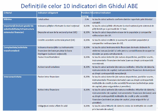 BNR a publicat in premiera lista bancilor de importanta sistemica din Romania Autor Irina Chitu 18.11.2015 3 3083 La conferinta EU-COFILE 2015, organizata pe parcursul acestei saptamani de catre BNR, impreuna cu Asociatia Romana a Bancilor (ARB ) si Alpha Bank la Sinaia, viceguvernatorul Liviu Voinea a facut publica astazi in premiera, lista bancilor de importanta sistemica din Romania.BNR a identificat in Romania 10 banci de importanta sistemica: BCR, BRD, UniCredit, Raiffeisen Bank, Banca Transilvania, ING Bank, Alpha Bank, Garanti Bank, CEC Bank si Bancpost."Identificarea bancilor de importanta sistemica face parte din procesul de convergenta a sistemului bancar romanesc catre un sistem bancar european integrat" a declarat viceguvernatorul Liviu Voinea.Este o cerinta obligatie care se bazeaza pe o directiva europeana - Directiva 2013/36/UE, iar metodologia de calcul apartine Autoritatii Bancare Europene (ABE).Pana la sfarsitul acestui an si apoi trimestrial, toate bancile centrale din Uniunea Europeana trebuie sa faca acesta analiza si au obligatia sa publice lista bancilor de importanta sistemica o data pe an. Astfel, bancile de importanta sistemica la nivel global, prezente si in Romania (raportate pana in prezent la Comitetul European pentru Risc Sistemic – CERS) sunt ING, BRD si Unicredit.Ce sunt bancile sistemice?Conform definitiei din directiva, o institutie de importanta sistemica este "o institutie al carei faliment sau a carei functionare defectuoasa ar putea declansa un risc sistemic".In caz de probleme, aceste banci intra automat sub incidenta mecanismelor de rezolutie si redresare.In mecanismele de rezolutie, in caz de faliment al unei banci, actionarii sunt primii care suporta costurile si abia apoi celelalte categorii de participanti (de exemplu deponentii cu peste 100.000 euro in banca), iar statele au aceasta optiune, dar nu sunt obligate sa suporte costurile de redresare (bail-in).Se introduce de asemenea si o cerinta de capital suplimentar, de 1-2 puncte procentuale, insa bancile romanesti au o capitalizare mare (deci nu au nevoie de capital suplimentar).Cele 9 banci de importanta sistemica, persoane juridice romane (cea dea 10-a, ING fiind sucursala) aveau la septembrie 2015 o rata a fondurilor proprii totale de 17.3%, credite neperformate de 11.8% (usor sub media sistemului) si o rentabilitate pozitiva.De ce este bine sa identificam bancile de importanta sistemica?Aceasta analiza reprezinta un instrument util de politica macroprudentiala.Pana la publicarea metodologiei Autoritatii Bancare Europene (ABE), BNR a folosit in perioada 2012-2014 o metodologie proprie, dezvoltata impreuna cu Comisia Europeana si Fondul Monetar International. Aceasta metodologie bazata pe 6 criterii se pastreaza si se adauga suplimentar metodologiei obligatorii ABE, pentru a respecta specificul national.Cele 6 criterii suplimentare, care se pastreaza, sunt: volumul creditelor acordate, volumul depozitelor atrase, prezenta pe piata interbancara, apartenenta la sistemului de plati ReGIS, prezenta pe piata titlurilor de stat si vulnerabilitatea la contagiunea in relatia mama-fiica (ia in calcul sursele atrase si retrase de la banca mama).Modul de calcul al scorului finalConform Ghidului ABE, se calculeaza un scor pe baza unor criterii obligatorii de: marime, importanta, complexitate si interactivitate, fiecare avand o pondere de 25% in scorul final. Aceste criterii contin la randul lor 10 indicatori obligatorii, cu pondere egala in cadrul fiecaruia dintre cele 4 criterii.Daca ar fi o singura banca in sistem, punctajul maxim ar fi 10.000 puncte.Ghidul ABE recomanda utilizarea unui prag de 350 de puncte de baza pentru desemnarea bancilor sistemice +/- 75 de puncte.BNR foloseste pragul minim recomandat de ABE, de 275 puncte si la recomandarea Comisiei Europene , pentru surprinde mai bine sistemul bancar si de sa respecta specificitatea acestuia in Romania.BNR analiza si pana acum bancile cu importanta sistemica - un element suplimentar care apare din acest an, conform Directivei 2013/36/UE, este obligativitatea si transparenta la nivelul tuturor statelor membre. Articole similare Financiar Subiecte relevante faliment actionari ABE (Autoritatea Bancara Europeana) BNR (Banca Nationala a Romaniei) banci Q & A UNursac neculai Banca Carpatica nu indeplineste conditiile de a fi banca sistemica? De ce? 51 0 20.11.2015 F/APFinZoom / Andreea Pietrosanu Banca Comerciala Carpatica nu este in aceasta lista acum (lista se calculeaza insa trimestrial). Unul din motive ar putea fi cel de marime (toate cele 10 banci din lista au peste 2% cota de piata in functie de active), alt motiv fiind cel ca este in curs de vanzare (aproape finalizata). Insa trebuie sa ai acces la toti indicatorii care intra in calculul acestui scor pentru a raspunde la aceasta intrebare – si doar BNR cunoaste in detaliu punctajul pentru fiecare indicator in parte. Sursa imagine: BNR 51 0 20.11.2015