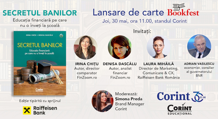 Cartea Secretul banilor - Educația Financiară pe care nu o înveți la școală va fi lansată pe 30 mai 2024 la Bookfest 28.05.2024 0 773 Dacă și tu vrei să descoperi care este Secretul Banilor, te invităm să ne fii alături joi, 30 mai, ora 11.00 la standul CORINT (B12) de la ROMEXPO, Pavilionul B2.Atunci va avea loc lansarea oficială a cărții "SECRETUL BANILOR - Educația fianciară pe care nu o înveți la școală" în cadrul "Bookfest - Salonul Internațional de Carte".Vei avea oportunitatea de a discuta cu Irina Chițu – autor, director comparator financiar FinZoom.ro, Denisa Dascălu – autor, analist financiar FinZoom.ro, Laura Mihăilă – Director de Marketing, Comunicare & CX, Raiffeisen Bank România dar și cu invitatul SPECIAL - Domnul Adrian Vasilescu, economist, jurnalist, Consilier al Guvernatorului BNR.Discuția va fi moderată de Simona Preda, Brand Manager Corint. Ne vedem joi! În cazul în care timpul nu-ți permite să ajungi la eveniment, poți comanda cartea pe https://edituracorint.ro/secretul-banilor-educatia-financiara-pe-care-nu-o-inveti-la-scoala.html, cu o reducere de 25%. Articole similare Educatie Subiecte relevante educatie financiar-bancara Q & A
