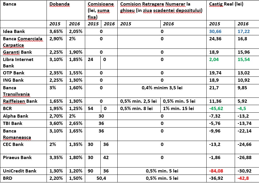 Castigul real din depozite in 2016 vs. 2015 - Antena 1 [VIDEO] Autor Andreea Pietrosanu 07.03.2016 4 2101 Inca de la inceputul anului 2015, dobanzile la depozite au continuat sa scada, astfel incat si castigul din depozite a fost afectat.Video - Click aiciDe exemplu, in aprilie 2015 puteai castiga la un depozit de 1.000 lei pe 12 luni aproximativ 30 lei, comparativ cu martie 2016, unde poti castiga aproximativ 17 lei (castigul aproape s-a injumatatit).Toate bancile au scazut dobanzile, insa in ceea ce priveste comisioanele de cont curent, majoritatea bancilor le-au pastrat la acelasi nivel, unele au decis sa le creasca (Piraeus Bank, CEC Bank), iar altele sa le scada (Unicredit Bank) sau chiar sa renunte la ele (BCR si Libra Internet Bank). Astfel, se observa ca singurele banci care au inregistrat o crestere a castigului real din depozite in ultimul an, sunt cele doua banci care au renuntat la comisioanele de cont curent, Libra Internet Bank si BCR (care ar fi trecut si ea la castig real pozitiv, daca nu ar fi marit comisionul de retragere numerar de la ghiseu, la scadenta depozitului).Astfel, acum poti pierde intr-un an la un depozit de 1.000 lei maxim 43 lei, insa acum un an pierdeai aproximativ 84 lei. La fel ca in cazul castigului, suma maxima pe care o poti pierde este la jumatate fata de anul trecut.Studiu de Caz – 1.000 lei / 12 luniCastig Real Aprilie 2015 vs. Martie 2016 Sursa: www.finzoom.roCompara pe FinZoom.ro la Sectiunea Depozite la Termen.Dupa cum se poate observa din tabel, castigul cel mai mare il veti avea la Idea Bank (castigul cel mai mare in prezent cat si acum un an), iar cel mai mult puteti pierde acum la BRD (-42,8 lei), fata de UniCredit Bank in aprilie 2015 (-84 lei ).Pe langa depozite, au fost semnalate modificari si in structura comisioanelor fie de cont curent cat si de retragere numerar la scadenta (ghiseu).Modificari privind comisioanele lunare de cont curent au fost inregistrate la:Libra Internet Bank - de la 2 lei la 0 leiPiraeus Bank – de la 2,5 lei la 3,5 leiCEC Bank – de la 2,5 lei la 3 lei BCR – de la 4,5 lei la 0 leiUniCredit Bank – de la 7,5 lei la 3 leiDoua banci au facut modificari in ceea ce priveste comisionul de retragere numerar la scadenta, Raiffeisen a majorat comisionul la 0,5% minim 5 lei, iar BCR la 1% minim 15 lei de la 0,5% minim 8 lei.Sursa video: Antena 1 Articole similare Depozite la Termen Video Subiecte relevante comision retragere numerar comisioane conturi comision administrare cont depozit dobanda comisioane Q & A