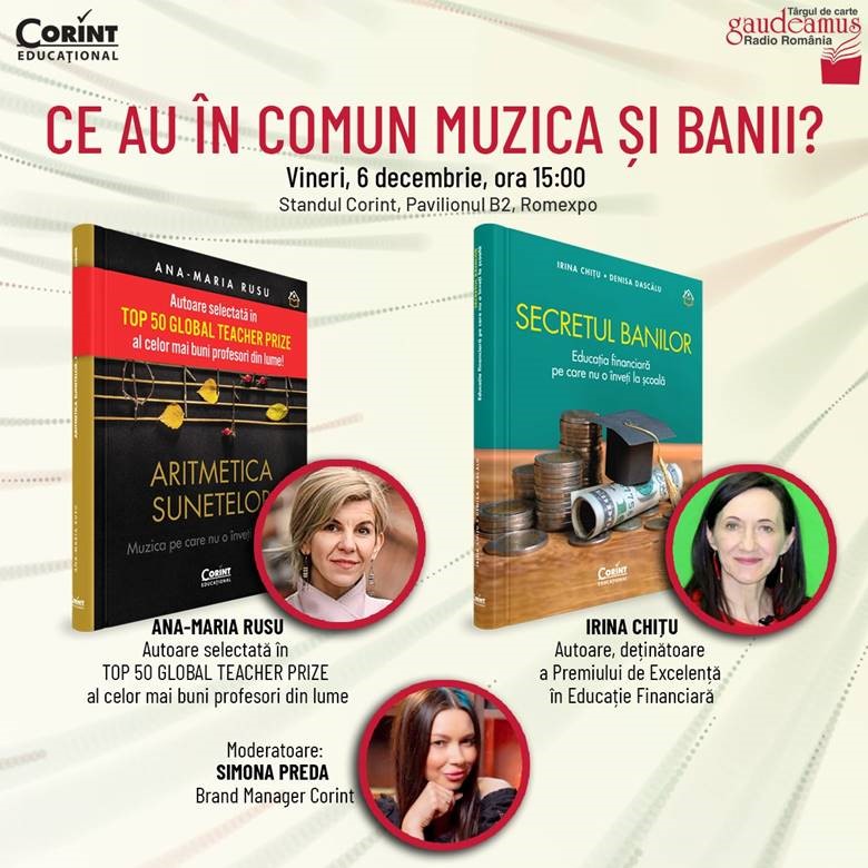 În cadrul acestui eveniment vei avea ocazia să discuți cu Ana-Maria Rusu, profesor Proiectul Merito, autoarea cărții Aritmetica sunetelor. Muzica pe care nu o înveți la școală selectată în TOP 50 GLOBAL TEACHER PRIZE al celor mai buni profesori din lume și cu Irina Chițu, fondatoare FinZoom.ro, deținătoare a Premiului de Excelență în Educație Financiară și autoarea cărții Secretul banilor. Educația financiară pe care nu o înveți la școală.