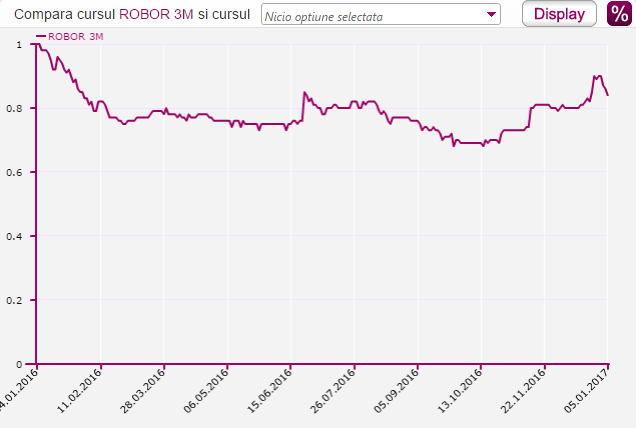 Ce se intampla cu ratele romanilor? Indicele ROBOR 0,90% in ultima zi a anului - Digi 24 [VIDEO] Autor Denisa Dascalu 05.01.2017 3 3439 Noul an nu pare a aduce surprize placute romanilor care au credite cu dobanda variabila. Acest lucru se intampla ca urmare a faptului ca in 27 decembrie indicele ROBOR la 3 luni a inregistrat cea mai mare valoare din ultimele 12 luni, respectiv 0,90%, valoare mentinuta chiar si in ultima zi a anului.Astfel, ajustarea dobanzilor pentru urmatoarele 3 luni din acest an se va face in functie valoarea indicelui din ultima zi lucratoare a anului 2016. La bancile la care indicele ROBOR se actualizeaza trimestrial, ratele aferente lunii ianuarie vor fi mai mari.Sursa video: Digi 24Creditele Prima Casa s-au scumpitSimulare credit Prima CasaSuma: 225.000 lei (50.000 euro echivalent)Perioada: 30 aniDobanda: ROBOR 3M + 2%Comisioane: 0,49% anual, calculat la valoarea garantiei (si anume 50% din soldul finantarii garantate / sau a principalului).Simulare calcul rata Septembrie 2016 vs Ianuarie 2017 Luna Indice ROBOR Crestere ROBOR Rata (lei) Septembrie (30 septembrie 2016) 0,69% - 911,41 Ianuarie 2017 (3 ianuarie 2017) 0,90% 0,21 pp 936,52 Comparativ cu trimestrul anterior, cand s-a realizat ajustarea dobanzilor, cresterea indicelui ROBOR a contribuit la majorarea ratei la un astfel de credit cu aproximativ 26 de lei (de la 911 la 937 lei).Sursa: www.finzoom.ro/statistica/indici-de-referinta/robor-3m-3luna/Avem si vesti buneAnul 2017 vine si cu vesti bune deoarece Programul Guvernamental Prima Casa continua, iar plafonul alocat acestuia este de 2,5 miliarde de lei.Citeste si: Prima Casa continua si in 2017 - Antena 1 [VIDEO] Articole similare Prima Casa Video Indici interbancari Subiecte relevante ROBOR (Romanian Interbank Offer Rate) dobanda variabila dobanda rata lunara Q & A
