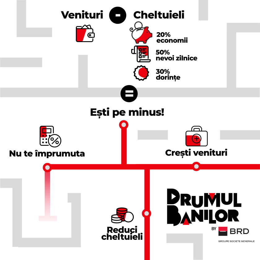 Iar dacă ești pe minus, NU te împrumuți. Nu te împrumuți niciodată pentru a acoperi cheltuielile curente. Ci cauţi o soluţie fie pentru creşterea veniturilor, fie pentru reducerea cheltuielilor. Adică găsești soluții pentru optimizarea bugetului personal.