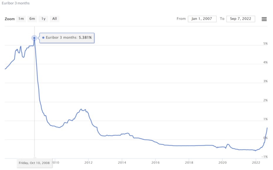 În prezent valoarea indicelui EURIBOR la 3 luni a ajuns la 0.836% și este în continuă creștere din 14 iulie când a devenit pozitiv (pe 13 iulie era -0,052%).