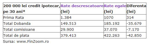 ipotecar de 200.000 lei pe 30 ani, plătești cu aproape 43.000 lei mai puține dobânzi și comisioane, doar din alegerea tipului de scadențar, cu rate descrescătoare.