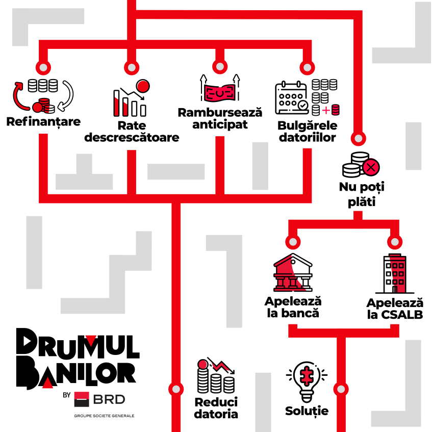 Ce soluții poate oferi banca? Refinanțarea creditului, reducerea costurilor, reducerea soldului, perioada de grație, reeșalonare sau rescadențare, conversie valutară, suspendarea ratelor, mărirea perioadei creditului (atenție: în acest caz se măresc costurile totale ale creditului, dar poate fi o gura de oxigen pentru o perioadă).