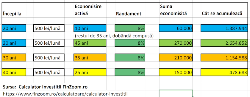 investiții, important este să începi cât mai devreme, fiindcă timpul acționează în favoarea ta, atunci când te folosești de puterea dobânzii compuse (adică nu retragi banii câștigați ca dobândă sau randament, ci îi lași acolo să fie în continuare investiți și să beneficiezi de dobândă la dobândă).