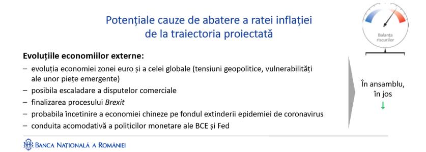In luna februarie, BNR prognoza o scadere a ratei anuale a inflatiei (IPC) pentru primele trimestre in 2020, la 2.8% si spunea ca s-ar putea sa scada chiar mai mult, pe fondul evolutiilor negative inregistrate in economiile externe si din cauza coronavirusului.