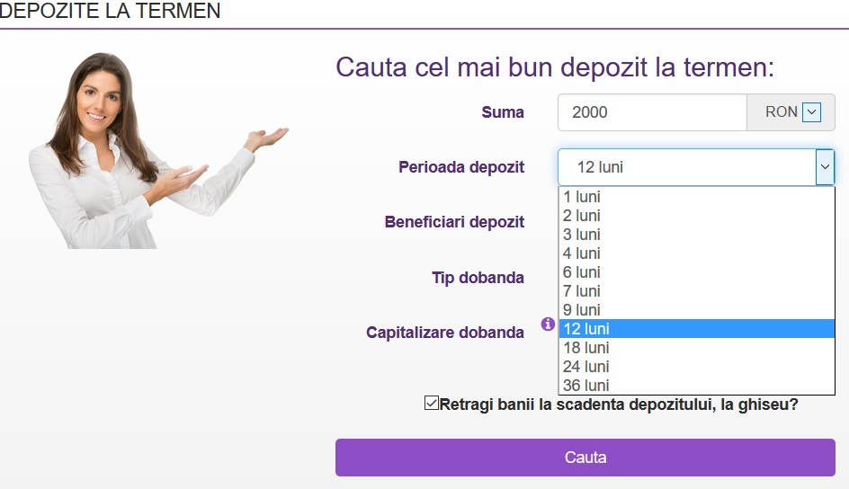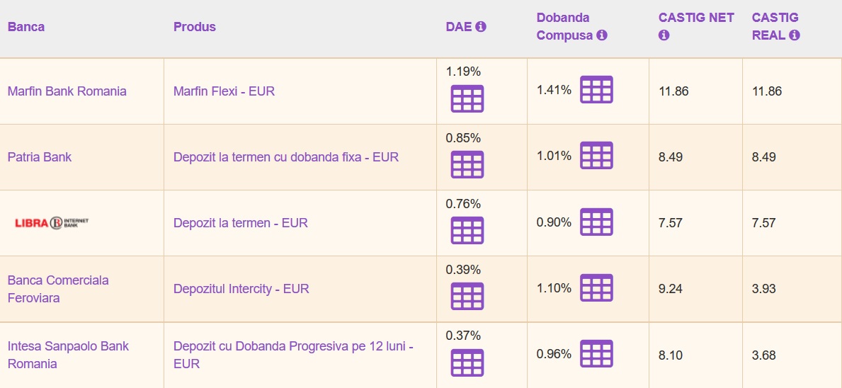 La un depozit de 1.000 euro pe un an castigi maxim 12 euro. Top 5 depozite in euro Autor Andreea Pietrosanu 04.07.2016 1 1910 Dobanzile la depozite au fost in continua scadere de la inceputul anului, fapt ce a determinat castiguri din ce in ce mai mici sau chiar pierderi.Compara pe FinZoom.ro Depozitele in functie de DAE si Castigul RealPentru a compara in mod real castigul din depozite, FinZoom.ro a lansat, in aprilie 2016 in premiera pentru Romania, DAE pentru Depozite (Dobanda Anuala Efectiva = Dobanda Reala) si Castigul Real.DAE pentru depozite tine seama, pe langa dobanda nominala anuala oferita de banca, de taxele (16% impozit) si comisioanele platite bancii (comision de administrare lunar, deschidere/inchidere cont curent si comision de retragere numerar la ghiseul bancii, in ziua scadentei depozitului).Citeste si: Ce este DAE pentru Depozite?Top 5 Depozite 1.000 Euro pe 12 luniSursa: http://www.finzoom.ro/depozite/la-termen/ Atentie la costurile practicate de banci! Pentru aceeasi suma poti ajunge sa pierzi chiar 17 euro.Vezi care sunt comisioanele care "musca" din castigul tauPe langa comisioanele ce intra in calcul DAE, trebuie sa fii atent si la aceste comisioane.Citeste si: Depozite cu dobanzi reale negative la majoritatea bancilor. Alternative de EconomisireImportant! Pe FinZoom.ro poti compara toate depozitele de pe piata si poti alege suma si perioada dorita.Sursa: http://www.finzoom.ro/depozite/la-termen/ Subiecte relevante comision retragere numerar comision deschidere cont comision administrare cont depozit taxe dobanda comisioane impozite Q & A
