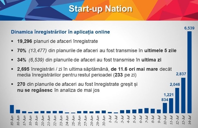 "Pentru noi, faptul ca au fost peste 19 mii de proiecte depuse, insumand o valoare a finantarii solicitate de aprox. $ 1 miliard (3,7 mld. de lei) si cca. 45 mii noi locuri de munca, reprezinta un important succes de etapa. Increderea pe care ne-o acorda acesti antreprenori arata, inca o data, faptul ca Programul Start-up Nation raspunde unei nevoi reale a mediului de afaceri autohton.