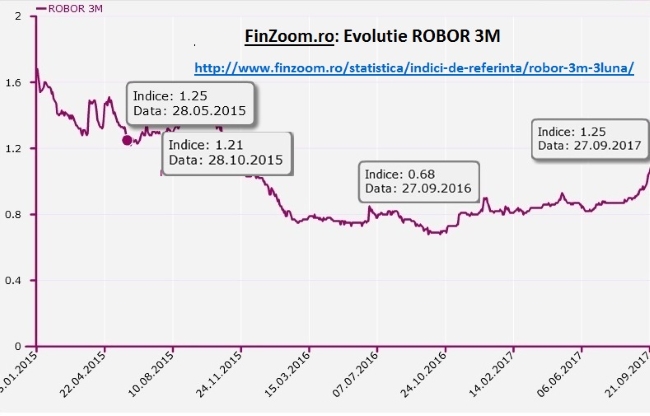 ROBOR-ul isi continua cresterea de la o zi la alta, astazi (27 septembrie 2017) inregistrand valoarea de 1,25%, cea mai mare din ultimii doi ani ( dupa 28.10.2015 cand a fost 1,21%).