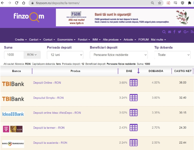 compara castigul real oferit de fiecare banca (si anume, castigul din dobanda, minus taxe si comisioane – fiindca altfel se pot trezi ca la scadenta retrag mai putini bani decat au depus). Comparatorul online FinZoom.ro ii poate ajuta sa ia cea mai buna decizie, calculand o dobanda anuala efectiva (DAE) pentru toate depozitele din piata bancara, alaturi de castigul real pentru banii depusi.