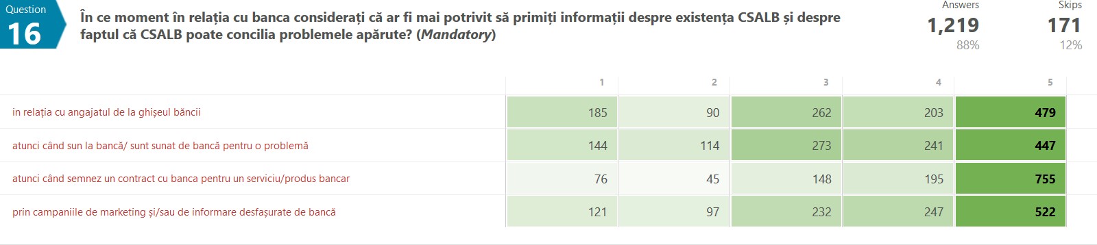 La intrebarea privind momentul in relatia cu banca in care si-ar dori sa fie informati despre serviciile CSALB, consumatorii au clasat in topul preferintelor (62%) momentul cand semneaza un contract cu banca pentru un serviciu/produs bancar. 43% spun ca ar fi util sa afle despre CSALB din campaniile de marketing si/sau de informare desfasurate de banca. In plus, 39% dintre respondenti vor sa afle despre CSALB atunci cand interactioneaza cu angajatul de la ghiseul bancii, in timp ce 36% vor sa li se ofere informatii atunci cand intampina o problema cu banca.