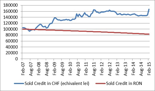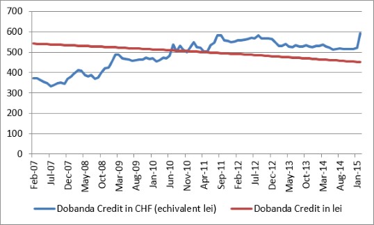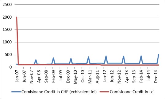 Studiu de Caz: Credit in Franci Elvetieni vs. Credit in Lei Contractat in 2007 Autor Irina Chitu 02.02.2015 1 3173 Pentru un imprumut de 100.000 lei pe 25 ani, unul in lei si unul in franci elvetieni (50.000 CHF / echivalent 100.000 lei), au fost luate in calcul si comparate cele mai bune oferte din piata, valabile la inceputul lunii februarie 2007.DAE (costul total al creditului = dobanda + comisioane) pentru creditul in CHF era mai mica cu 2,4 puncte procentuale fata de cea pentru creditul in lei, iar totalul de rambursat (daca s-ar fi mentinut aceeasi dobanda si acelasi curs valutar de la data acordarii) ar fi trebuit sa fie cu 39.361 lei mai mic decat pentru creditul contractat in lei – ceea ce explica decizia celor care s-au imprumutat in CHF, in detrimentul monedei locale.In plus, o familie de doua persoane ar fi trebuit sa aiba un venit lunar de peste 2600 lei pentru a contracta un credit in lei (versus 2100 lei pentru creditul in CHF), deoarece prima rata – la care se calcula gradul de indatorare maxim permis in 2007 (de 35%) era de 775 lei pentru creditul in lei si doar 673 lei pentru cel in CHF.In 2007 majoritatea bancilor nu calcula dobanda variabila transparent (nu era trecut in contract din ce este formata dobanda: indice LIBOR/ROBOR + marja) ca sa vedem cum au evoluat dobanzile celor doua credite…De exemplu, LIBOR a tot scazut in aceasta perioada, dar dobanzile in contracte au ramas fixe (iar atunci cand bancile au fost obligate sa calculeze dobanzile in functie de indice plus, marja au venit cu acte aditionale care introduceau valoarea LIBOR mica, plus o noua marja mai mare, ca sa rezulte dobanda din contractul initial).Evolutia ratei lunare, presupunand ca DAE (dobanda si comisioane) nu s-a modificat pe parcursul anilor februarie 2007-2015. 100.000 lei (50.000 CHF)/ 25 ani, cele mai bune oferte valabile la 1 februarie 2007 Banca Transilvania - Credit imobiliar cu dobanda fixa 3 ani - RON Volksbank - Credit Casa 75 - CHF Dobanda 6,50% 4,25% Comision Analiza Dosar 2% (la sold) 60 CHF Comision de Administrare Lunar 0,10% (la sold) 0,10% Comision Administrare Anual - 80 CHF DAE 8,23% 5,83% Prima rata 775 lei 321 CHF (echiv. 673 lei) Total de rambursat 223.495 lei 92.067 CHF (184.134 lei) Total comisioane 20.934 lei 10.806 CHF (21.613 lei) Total dobanda 102.561 lei 31.260 CHF (62.521 lei) Scadentar Credit in RON Credit in CHF Grad maxim de indatorare 35% 35% Avans 25% 25% Practic este evolutia ratei lunare influentata doar de cursul de schimb, conform scadentarului fiecarui credit.Pana in Octombrie 2008, ratele lunare la creditul in CHF au fost mai mici decat la cel in RON (cu o mica exceptie in februarie 2008, cand la creditul in CHF s-a platit comisionul anual).Incepand cu noiembrie 2008 (curs 2,4787 RON/CHF) ratele la creditul in CHF au fost din ce in ce mai mari. De peste doua ori mai mare este acum rata la creditul in CHF / echivalent in lei, fata de rata la creditul in lei (1656 lei vs. 758 lei).In ceea ce priveste soldul celor doua credite, daca in februarie 2015 clientul ar vrea sa faca o refinantare, cel cu credit in CHF mai are de dat bancii 39.298 CHF (acum echivalent 166.776 lei), iar cel cu credit in lei doar 82.243 lei. De aceea refinantarea nu este deloc benefica in acest moment, cum la fel nici conversia creditului in CHF in lei, la cursul actual.In cele 97 de rate s-au platit, la:Creditul in lei: 74.452 lei (48.514 lei dobanda + 10.957 lei comisioane)Creditul in CHF: 96.759 lei (47.189 lei dobanda + 15.550 lei comisioane)Valoarea dobanzilor se intersecteaza in iulie 2010 (la un curs de 3,3089 lei/chf) Link-urile catre cele 2 scadentare:Creditul in CHF (toate sumele sunt in CHF)Creditul in lei Subiecte relevante dobanda variabila moneda credit RON (lei) credit ipotecar DAE (Dobanda Anuala Efectiva) rata lunara CHF (Franci Elvetieni) scadenta Q & A