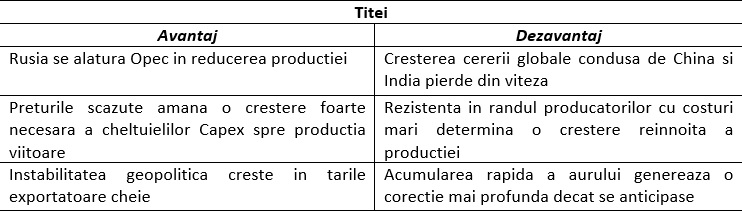 Primul an de evolutie pozitiva pentru marfuri? Analiza Saxo Bank 12.10.2016 0 1484 Ole Hansen semneaza articolul care incheie prognoza trimestriala pe Q4 2016 realizata de Saxo Bank. Hansen crede ca 2016 ar putea fi primul an de crestere pentru marfuri din 2010 incoace, chiar daca pretul petrolului va mai ramane... jos pentru o vreme. Contextul delicat politico-economico-...meteorologic face ca prognoza pe acest final de an sa fie extrem de dificila. Analiza Trimestriala Saxo Bank: Verde, dar pazit Marfurile sunt aproape de a avea primul an pe verde din 2010 incoace, dar mai exista preocupari pe mai multe fronturi. Titeiul si aurul in special se confrunta cu o varietate de evenimente de risc ce ar putea duce la scaderea preturilor inainte de inceputul anului 2017. "Factorul care iese in evidenta dintre factorii cheie determinanti ai redresarii aurului si argintului a fost caderea continua a randamentelor globale ale obligatiunilor.""Pe parcursul trimestrului final, anticipam ca intervalul de la 45$ la 50 si un pic sa fie mentinut pentru titeiul Brent."Marfurile isi mentin traiectoria de a inregistra primul lor an de randamente pozitive ale investitiei din 2010 incoace. Insa, avand in vedere ca indicele Bloomberg Commodity a crescut cu mai putin de 10%, totul s-ar putea schimba inainte de finalul anului. In timp ce sectorul energetic continua sa se stabilizeze in urma unei lichidari de doi ani, sectorul metalelor pretioase, cu castigul sau de 25% a fost in primul rand cel care a ajutat la oprirea derutei marfurilor. Cererea globala pentru marfuri trebuie inca sa se redreseze, pe masura ce apar in continuare intrebari legate de cresterea globala. In schimb, majoritatea castigurilor – cu exceptia celor din cazul metalelor pretioase – s-au datorat ajustarii ofertei, fie prin reducerea productiei (petrol si metale industriale) sau prin intreruperi involuntare cauzate de vreme (usoare). Pretul petrolului mai scazut pentru mai multa vreme Din pozitia avantajoasa a inceputului de an 2016, se anticipase masiv ca trimestrul final va aduce o redresare ferma pentru preturile petrolului. Se considera ca pretul scazut pentru o perioada prelungita ar declansa, in cele din urma, o evolutie pozitiva puternica a cresterii, reducand indeajuns productia foarte costisitoare pentru a echilibra piata. In schimb, piata petrolului ramane blocata intr-un interval de 45$ - 50$/baril din care se va lupta sa scape pana la finalul anului. Oferta in crestere a OPEC (atat din noua productie, cat si datorita intreruperilor mai putine ale aprovizionarii), alaturi de faptul ca productia din Rusia a atins noi niveluri record, a intarziat din nou procesul de re-echilibrare. In plus, in trimestrul trecut s-a observat aparitia unei rezistente in randul producatorilor cu costuri ridicate din SUA care din nou sporesc numarul de sonde in contextul stabilizarii productiei de petrol Strategia "pump-and-dump" introdusa de Arabia Saudita in noiembrie 2014 a fost anulata la intalnirea din 28 septembrie, cand membrii OPEC aflati in Alger au decis sa reduca productia cu pana la 700.000 barili/zi, anticipandu-se ca alocarea va fi convenita la urmatoarea sedinta OPEC din 30 noiembrie. Decizia a fost luata pentru a stabili un prag minim al pietei, pragul maxim fiind limitat pana cand excedentul global va incepe sa dea semne ca se reduce. Au ramas fara raspuns cateva chestiuni:1) Cine va face reducerea, dat fiind ca unii membri, printre care Nigeria, Libia si nu in ultimul rand Iranul, vor fi exclusi. 2) Cine va face reducerea baril-pentru-baril a posibilei cresteri ce vine din Nigeria si Libia? 3) Se va conforma, de fapt, OPEC deciziei luate? Istoria recenta arata ca productia reala a depasit de cele mai multe ori limitele agreate. 4) Cand vor intra in vigoare reducerile? Daca nu are loc un acord inainte de 30 noiembrie, impactul are slabe sanse de a fi resimtit in mare parte a anului 2017. Diavolul se ascunde in detalii. Aceasta a fost decizia usoara in comparatie cu negocierea dura ce are loc inainte de sedinta din 30 noiembrie. Daca Rusia se alatura, este un acord potrivit ce ar putea propulsa petrolul inapoi la nivelul din iulie, dar putin probabil mai sus de atat in aceasta etapa. Producatorii americani au profitat de posibilitatea acoperirii riscurilor in 2017 si 2018. Intre timp, experimentele bancilor centrale cu randamentele negative au asigurat faptul ca multi investitori au fost pregatiti sa dea bani cu imprumut acestui sector. Daca va avea succes, acordul Opec va bucura producatorii americani si alti producatori cu costuri ridicate, luand in considerare potentialul pe care il aduce pentru stabilizarea si, in final, stimularea productiei. Pe langa toate acestea, inca avem nevoie de preturi mai mari ale petrolului in viitor pentru a atrage investitiile necesare pentru a asigura rezerve stabile. Pe parcursul trimestrului final, anticipam ca intervalul de la 45$ la 50 si un pic sa fie mentinut pentru titeiul Brent. Acordul dintre producatorii OPEC de a reduce productia nu va avea cel mai probabil un impact major pozitiv asupra preturilor la acest moment. Insa va reduce timpul necesar pentru a diminua excedentul global de rezerve atat pentru titei, cat si pentru produsele derivate. Impactul pe termen lung al unei asemenea actiuni nu se va resimti, probabil, pana in 2017, bazandu-ne pe presupunerea ca cresterea cererii globale va fi mai mare. Intr-un raport recent, Agentia Internationala a Energiei a declarat ca cresterea cererii pentru petrol din China si India incetineste intr-un ritm mai rapid decat se preconizase initial, pe masura ce conditiile macroeconomice de fond raman nesigure. Fondurile speculative au generat mare parte a volatilitatii pe parcursul celui de-al treilea trimestru caci natura lor limitata a cauzat cateva semnale false in ambele directii. La randul lor, aceste semnale au sustinut declinul rapid si fluxul in pozitionarea speculativa, ceea ce a dus la aparitia unei volatilitatii crescute. Indreptandu-se cat