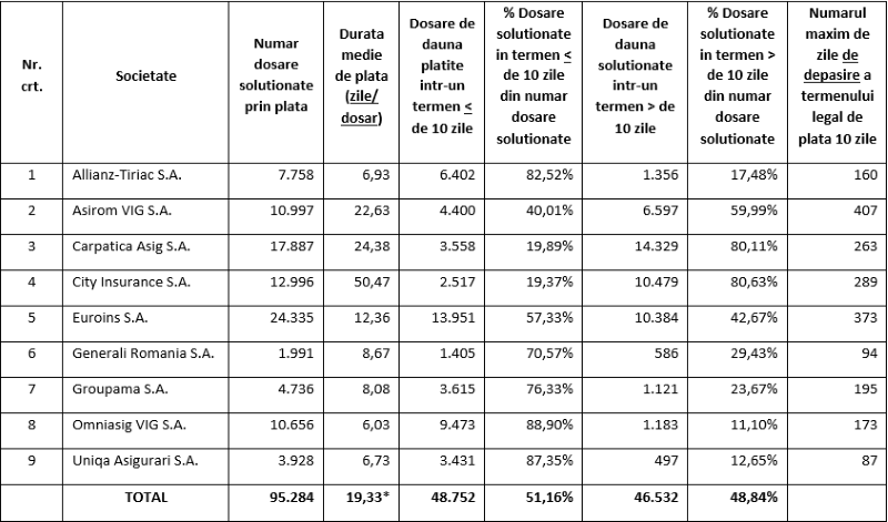 Conform analizei realizata de ASF, societatile a caror durata medie de plata depaseste termenul de 10 zile sunt: City Insurance S.A. - 50,47 zile/dosar, Carpatica Asig S.A. - 24,38 zile/dosar si Asirom VIG S.A. – 22,63 zile/dosar. Cea mai mica durata medie de plata a dosarelor de dauna a fost inregistrata de societatea Omniasig VIG S.A., respectiv 6,03 zile/dosar, un procent de 88,90% din dosarele de dauna RCA fiind achitate in termenul mai mic sau egal de 10 zile.