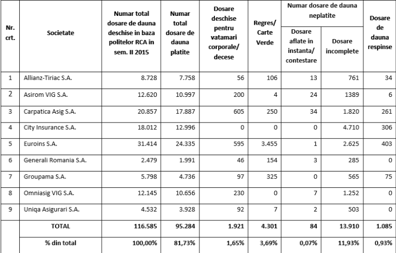 Astfel, in perioada iulie - decembrie 2015, societatile de asigurare au deschis un numar de 116.585 dosare de dauna pentru polite de asigurare obligatorie auto RCA, dintre care: 81,73% reprezinta dosare platite de catre asiguratori, 1,65% sunt dosare deschise pentru vatamari corporale/decese, 3,69% reprezinta dosare de regres, 12% sunt dosare neplatite (aflate in instanta/contestare sau sunt dosare incomplete), iar 0,93% sunt dosare respinse de la plata de catre asiguratori.