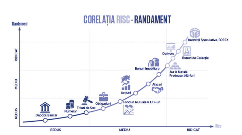 Însă, în general, cu cât riscul asumat este mai mare (cu cât poți tolera o variație, volatilitate mai mare a prețurilor), cu atât randamentul poate fi mai mare.