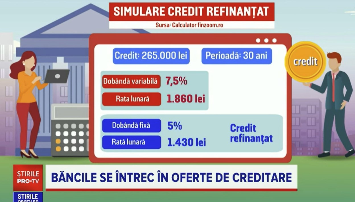 Refinanțare – Beneficii și la ce să fim atenți [VIDEO] Autor Irina Chitu 09.04.2025 4 711 Refinanțarea creditelor este o opțiune din ce în ce mai populară pentru cei care doresc să îmbunătățească condițiile de finanțare. Prin refinanțare se ia un credit nou prin care se închid unul sau mai multe credite vechi, de la una sau mai multe bănci. La un credit se pot face oricâte refinanțări, dar haideți să explorâm ce trebuie să avem în vedere atunci când cerem refinanțare și care sunt beneficiile acesteia. Sursa video: FinZoom.ro Sursa video: PRO TVCitește și: IRCC va scădea începând cu 1 aprilie 2025 – Credite cu dobândă fixă sub nivelul IRCC [VIDEO]Ce trebuie să avem în vedere atunci când cerem refinanțare?1. Beneficiile Refinanțării: Este esențial să ne asigurăm că refinanțarea aduce un avantaj clar, cum ar fi reducerea ratei lunare, scurtarea perioadei de rambursare sau consolidarea mai multor credite într-unul singur.2. Costurile Asociate: Trebuie să luăm în calcul costurile de refinanțare, care în cazul unui credit ipotecar pot include onorariile notarului, evaluatorului și alte taxe, ce se pot ridica la aproximativ 2.000 RON. De asemenea, există un ”comision unic la cererea clientului” pentru scrisoarea de refinanțare, care poate varia între 200 și 500 lei, în funcție de bancă.Unele bănci, pentru a atrage consumatorii, acoperă promotional și aceste costuri.3. Tipul Dobânzii: Este recomandat să optăm pentru o dobândă fixă, mai ales în contextul actual, unde dobânzile variabile sunt ridicate. Dobânzile fixe oferă predictibilitate și pot reduce costurile totale ale creditului. Important este să comparăm și să alegem o dobândă fixă cât mai mica.Compară creditele de la toate bancile pe FinZoom.ro4. Stabilitatea Economică: Trebuie să fim conștienți de contextul economic, deoarece dobânzile variabile pot rămâne ridicate din cauza inflației și a instabilității economice. Acest lucru poate influența decizia de refinanțare.Exemplu de Refinanțare credit ipotecarUn exemplu concret de refinanțare realizat de FinZoom.ro ilustrează beneficiile refinanțării unui credit cu dobândă variabilă, cu unul cu dobândă fixă.Să luăm în considerare un credit de 265.000 lei pe 30 de ani, în cadrul programului Noua Casă, cu o dobândă de 7.55% (IRCC= 5.55% + 2% marja băncii), având o rată lunară de 1.860 lei.Prin refinanțare la un credit ipotecar cu dobândă fixă de 5%, rata lunară ar scădea la 1.430 lei, ceea ce înseamnă o economisire de 430 lei pe lună. Alternativ, se poate opta pentru păstrarea aceleași rate de 1.860 lei, dar cu o reducere a perioadei de rambursare cu 12 ani, ceea ce poate duce la economii semnificative pe termen lung. Care Sunt Beneficiile Refinanțării?1. Reducerea Ratei Lunare: Refinanțarea poate duce la o scădere a ratei lunare, facilitând astfel gestionarea plăților.2. Reducerea Perioadei de Rambursare: O altă opțiune este păstrarea aceleași sume de plată, dar cu o perioadă de rambursare mai scurtă, ceea ce poate reduce costul total al creditului.3. Consolidarea Datoriilor: Refinanțarea permite combinarea mai multor credite sau carduri de credit într-un singur credit, simplificând gestionarea datoriilor.4. Schimbarea Monedei Creditului: Refinanțarea poate oferi oportunitatea de a schimba moneda în care este contractat creditul, ceea ce poate fi benefic în funcție de fluctuațiile valutare.5. Acces la Dobânzi Fixe: Multe bănci oferă dobânzi fixe inițiale mici, ceea ce poate oferi predictibilitate și siguranță în gestionarea plăților.Folosește calculatorul de refinanțare credit FinZoom.ro și vezi cu cât se reduce perioada și costul creditului tău.ConcluzieRefinanțarea poate fi o soluție eficientă pentru îmbunătățirea situației financiare, dar este crucial să evaluăm cu atenție costurile și beneficiile, precum și condițiile economice actuale. O decizie bine informată poate conduce la economii semnificative și la o gestionare mai eficientă a datoriilor. Articole similare Credite Video Subiecte relevante ROBOR (Romanian Interbank Offer Rate) evaluare imobil IRCC (Indicele de referinta pentru creditele consumatorilor) refinantare credit ipotecar dobanda rata lunara comisioane credit Q & A