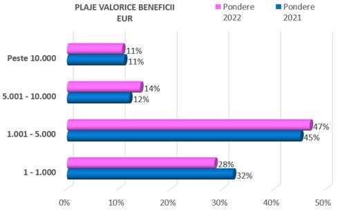 47% dintre consumatorii care și-au rezolvat prin negociere cu banca solicitările adresate CSALB în 2022 au obținut beneficii între 1.000 și 5.000 de euro. 11% dintre ei (aproximativ 60 de persoane) au reușit să obțină beneficii în urma negocierilor de peste 10.000 de euro.