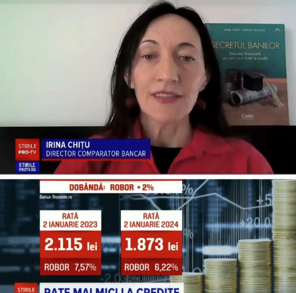 Irina Chițu, director FinZoom.ro: "Indicii bancari ROBOR și IRCC vor rămâne în jur de 6% până când BNR va decide să reducă dobânda de politică monetară (dacă inflația își menține trendul descendent, acest lucru se va întâmpla spre jumătatea anului) și se va menține excesul de lichiditate din piață.
